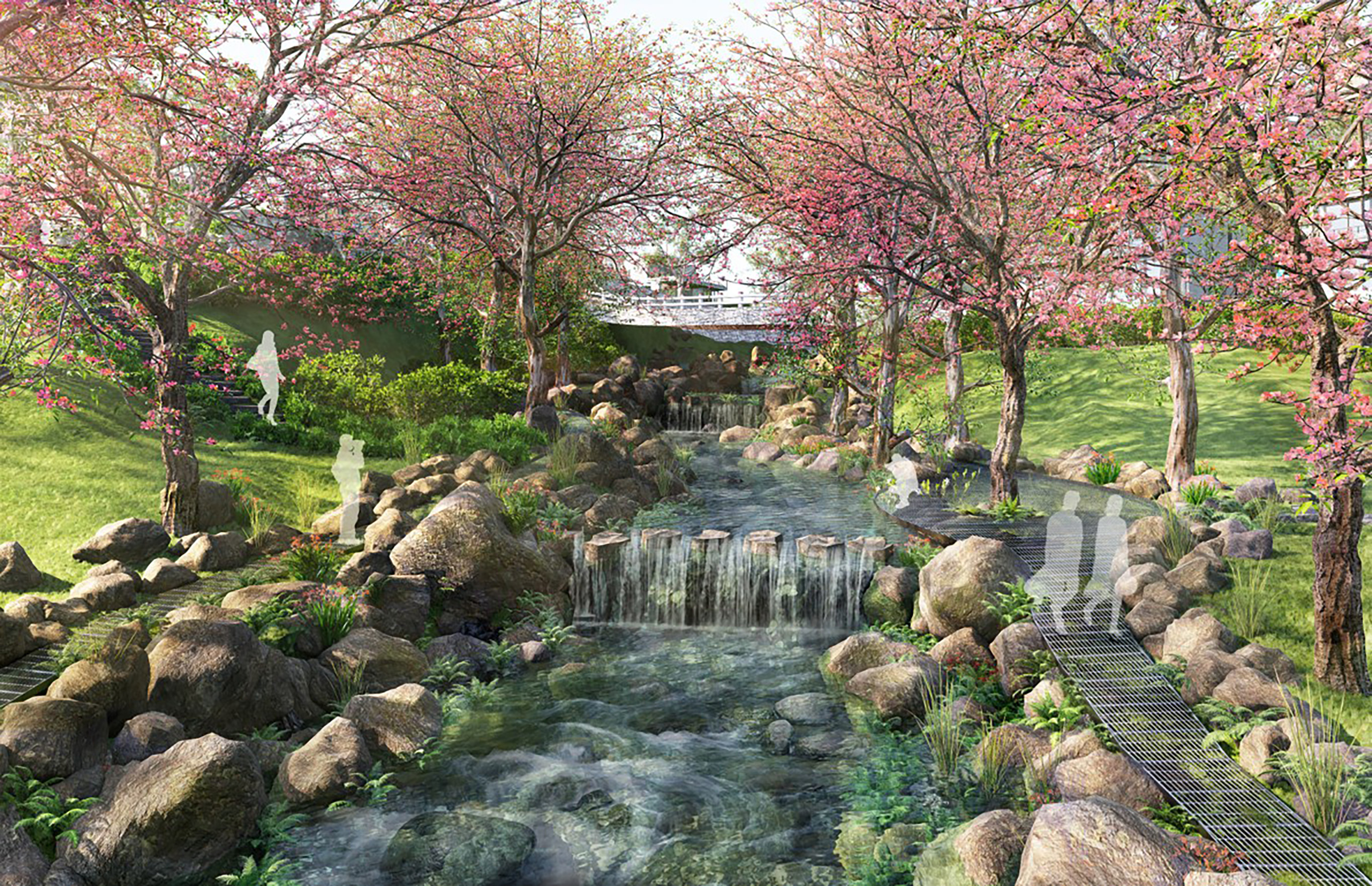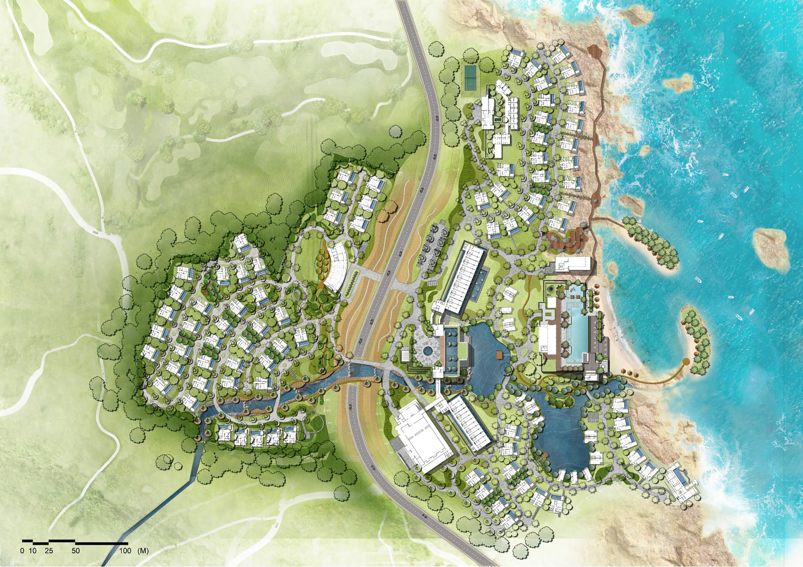 Bên cạnh các yếu tố nhân tạo, tính định hướng trong dự án Paradise Resort còn được hình thành từ chính cấu trúc tự nhiên của địa hình và hệ sinh thái. Nguyên tắc “lắng nghe ngôn ngữ của địa hình” phản ánh một cách tiếp cận trong đó thiết kế không áp đặt mà thích ứng, khai thác các dòng chảy tự nhiên, địa hình đồi núi và các yếu tố sẵn có để định hình hướng di chuyển. Đặc biệt, việc sử dụng dòng suối tự nhiên chảy xuyên qua khu vực và đổ ra biển như một trục tổ chức cảnh quan cho thấy định hướng không chỉ là yếu tố không gian mà còn là yếu tố sinh thái. Trong trường hợp này, chuyển động của nước đồng thời trở thành chuyển động của trải nghiệm, tạo nên sự gắn kết giữa con người và tự nhiên, đồng thời nâng cao tính bền vững của thiết kế.