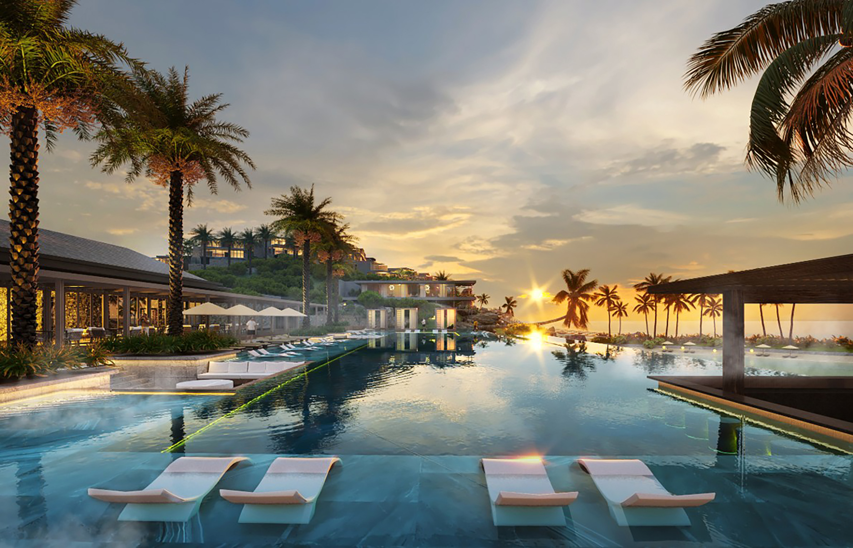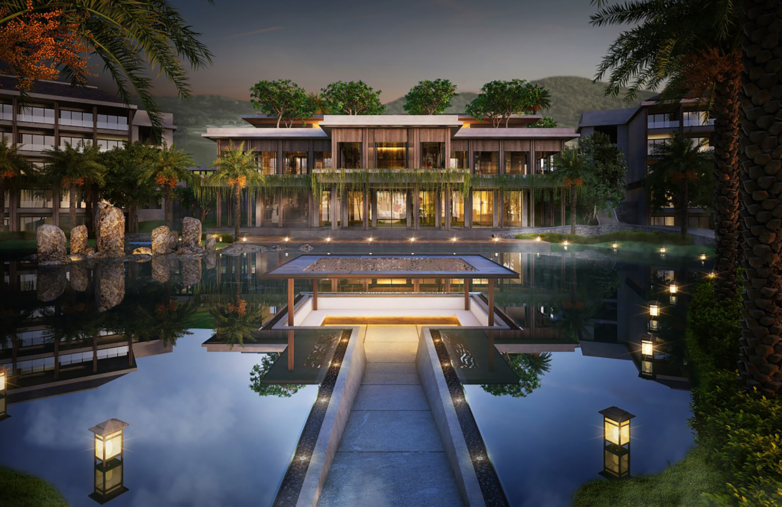 Một trong những chiến lược thiết kế quan trọng của Paradise Resort là khai thác yếu tố nước như một trục tổ chức cảnh quan và trải nghiệm. Dòng suối tự nhiên chảy xuyên suốt khu vực được bảo tồn và phát triển thành hệ thống cảnh quan nước đa tầng, kết nối từ đồi núi đến biển, tạo nên sự sống động và liên tục trong không gian. Các hồ điều hòa, hồ phản chiếu và không gian mặt nước không chỉ đóng vai trò điều tiết môi trường mà còn trở thành điểm nhấn thẩm mỹ, nơi ánh sáng, bầu trời và thiên nhiên được phản chiếu, mang lại cảm giác tĩnh lặng và thư giãn sâu sắc cho người sử dụng.