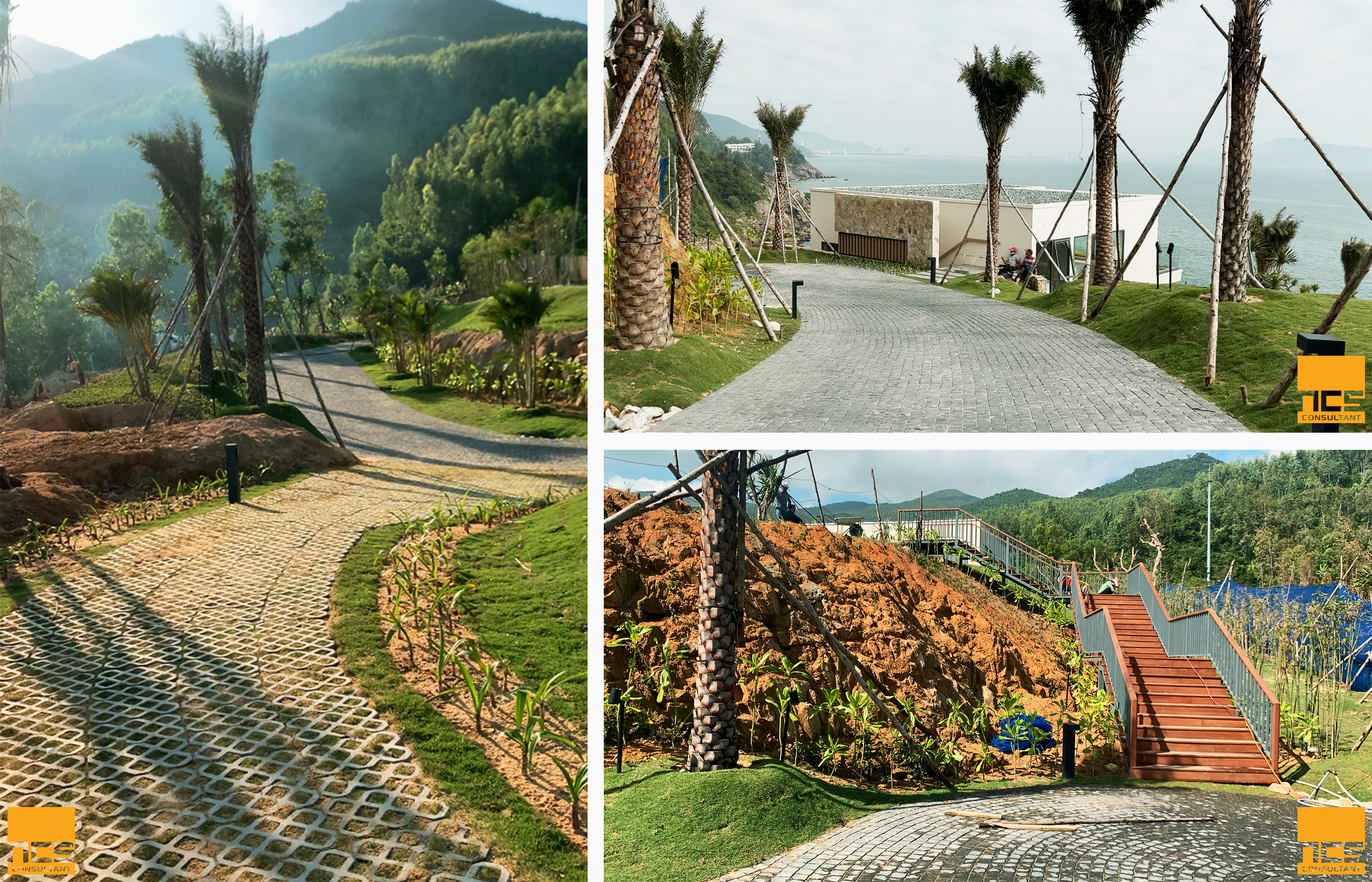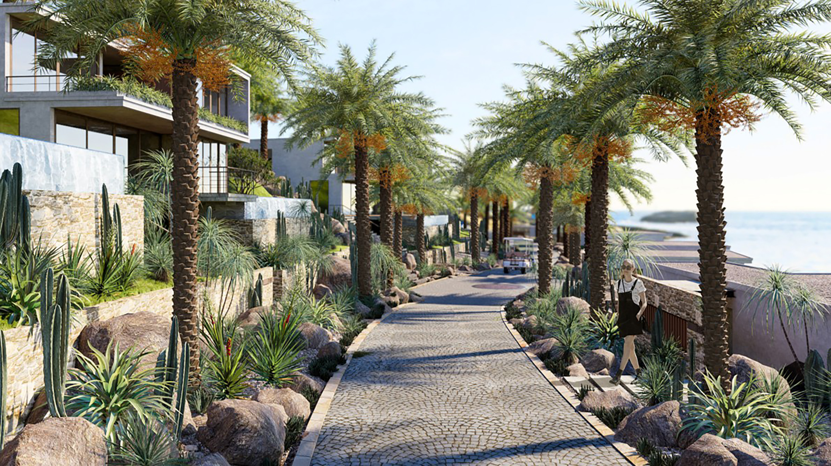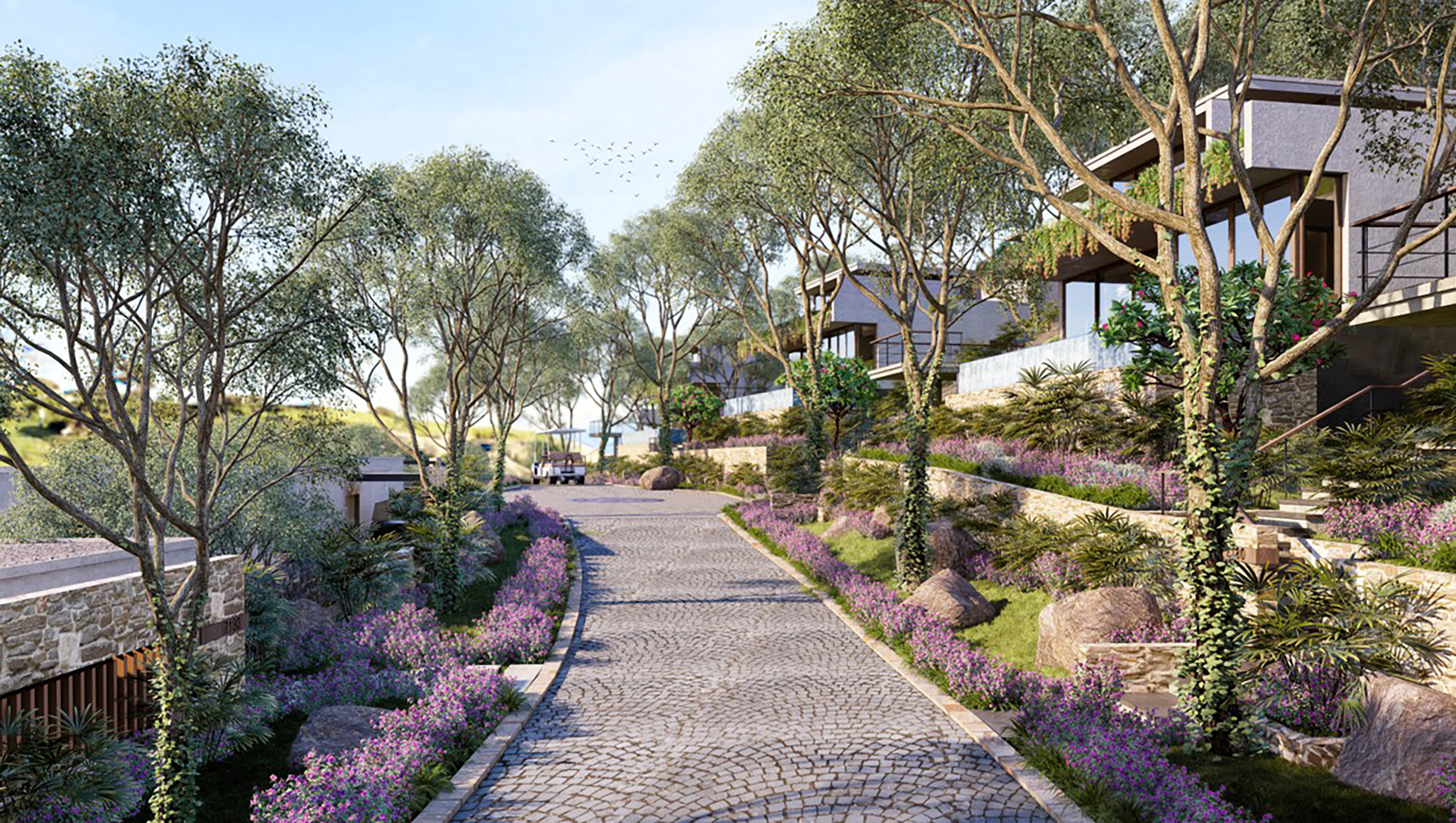 Hệ thống giao thông trong dự án được tổ chức như một cấu trúc định hướng rõ ràng, trong đó tuyến buggy đóng vai trò là trục kết nối chính, đảm bảo sự thuận tiện và liên tục trong di chuyển, đồng thời tạo nên ấn tượng về một hành trình xuyên suốt. Song song với đó, hệ thống đường đi bộ được thiết kế như một “hành lang trải nghiệm”, kết nối các điểm cảnh quan và dịch vụ thông qua những tuyến đường uốn lượn, đa dạng về vật liệu và không gian. Tại đây, người sử dụng không chỉ di chuyển mà còn được khuyến khích dừng lại, quan sát, cảm nhận và tương tác với môi trường xung quanh, từ đó tạo nên những khoảnh khắc trải nghiệm mang tính cá nhân và sâu sắc.