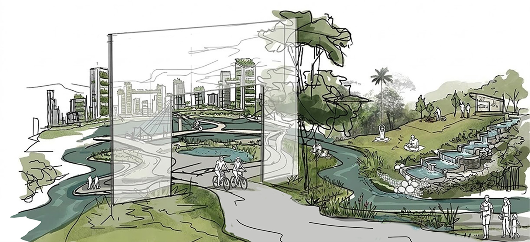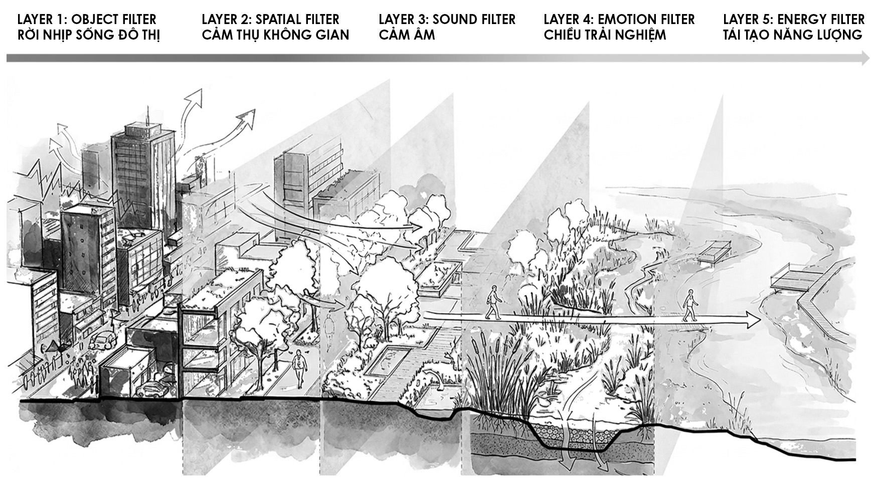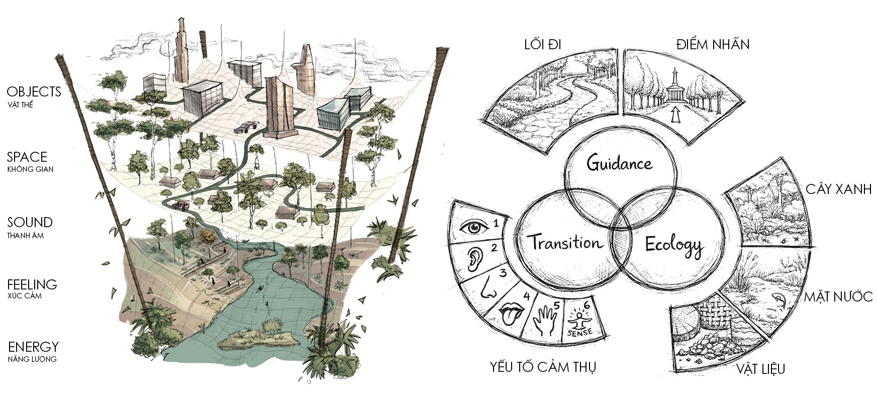 Áp dụng vào dự án Quận 9, theme không được thể hiện như một hình ảnh cụ thể, mà được phát triển như một “logic trải nghiệm”. Cảnh quan được tổ chức theo hướng mở, mềm và liên tục, trong đó các lớp cây xanh, mặt nước và lối dạo đóng vai trò liên kết các không gian chức năng. Ở đây, theme không nằm ở việc “trang trí theo phong cách”, mà nằm ở cách không gian vận hành: một dòng chảy liên tục giữa kiến trúc – cảnh quan – con người.
