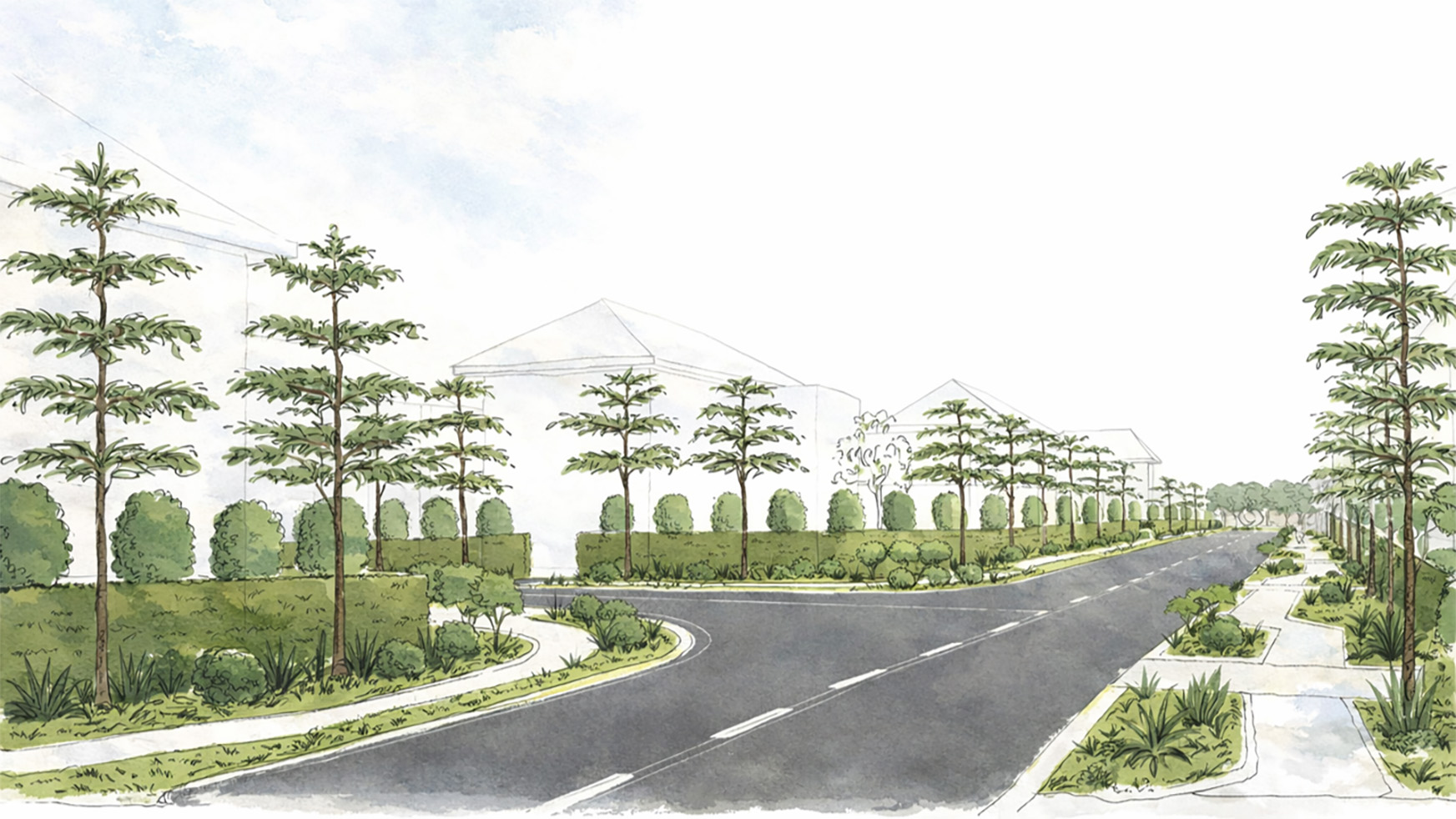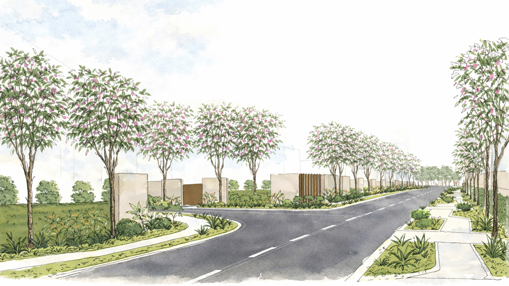 Trên tuyến đường dẫn vào khu ở, các lớ cây xanh tạo thành một bộ lọc tự nhiên giúp giảm dần âm thanh từ bên ngoài. Chuyển động của gió qua tán cây và mảng xanh trở thành yếu tố dẫn dắt trải nghiệm, mang lại cảm giác nhẹ nhàng và trong lành hơn cho hành trình.