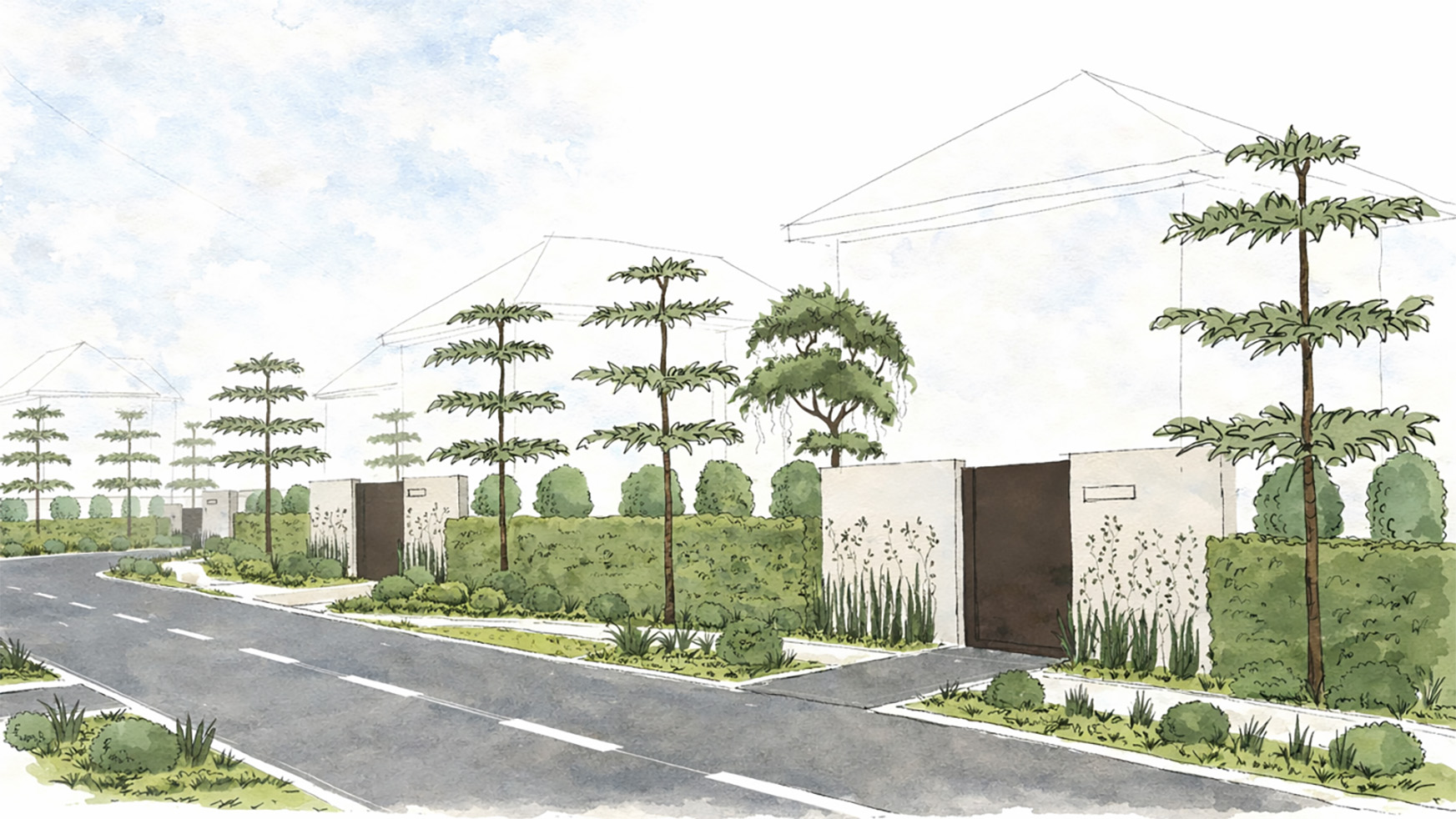 Cổng vào đóng vai trò như một ranh giới không gian giữa đô thị và cảnh quan bên trong. Sự xuất hiện của tự nhiên giúp thay đổi cảm nhận không gian và mở ra lớ trải nghiệm mới nơi thiên nhiên bắt đầu hiện diện rõ ràng hơn.