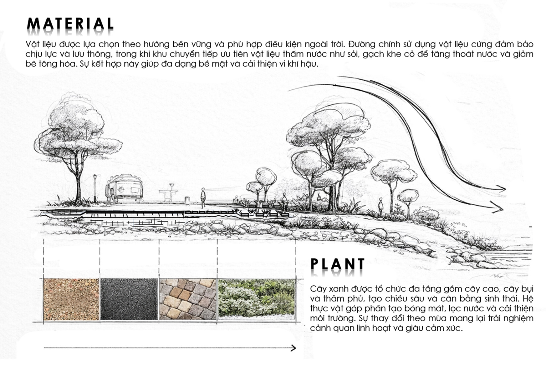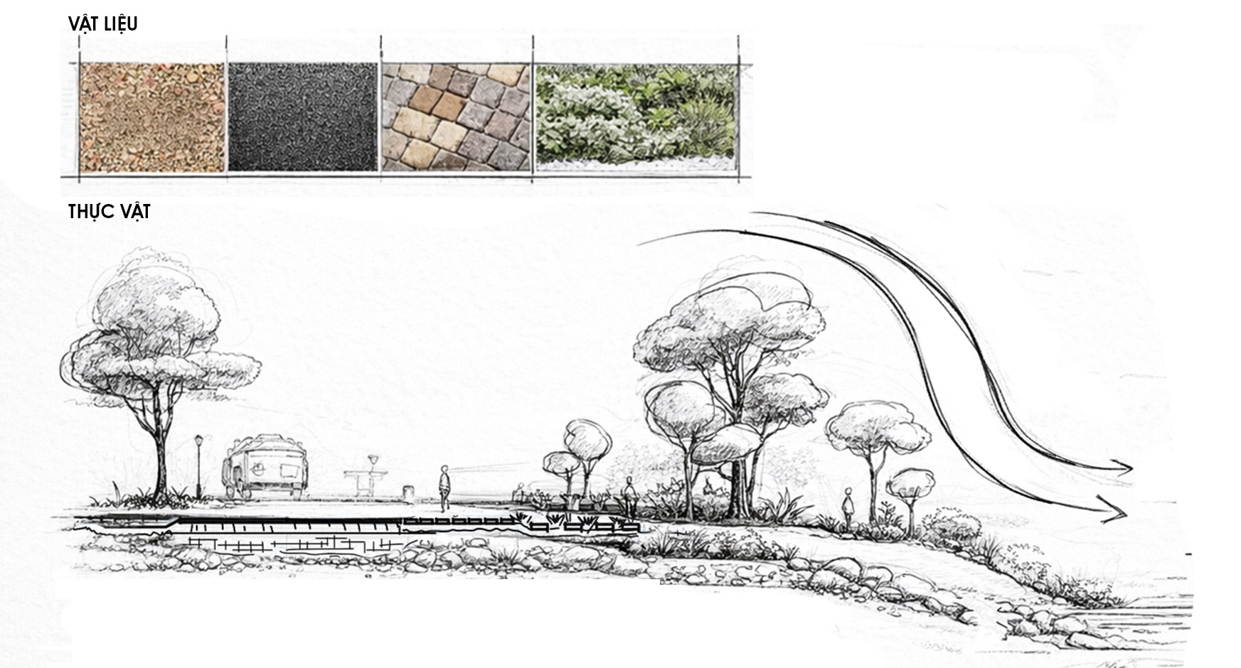 Các yếu tố thiết kế đều phục vụ cho theme này: hệ thực vật được lựa chọn theo hướng bản địa, phát triển tự nhiên; vật liệu ưu tiên tính thô mộc và bền vững; bố cục không gian giảm thiểu ranh giới cứng. Nhờ đó, cảnh quan không bị “đóng khung” trong một hình thức, mà mở ra khả năng thích nghi và phát triển theo thời gian—đúng với bản chất của một hệ sinh thái sống.